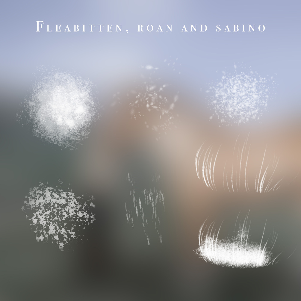 A whole pack just for equine coat related brushes and stamps! In this pack you'll get 56 brushes that includes coat textures, different types of markings, stamps and much more! Swipe through the pictures to see some swatches!